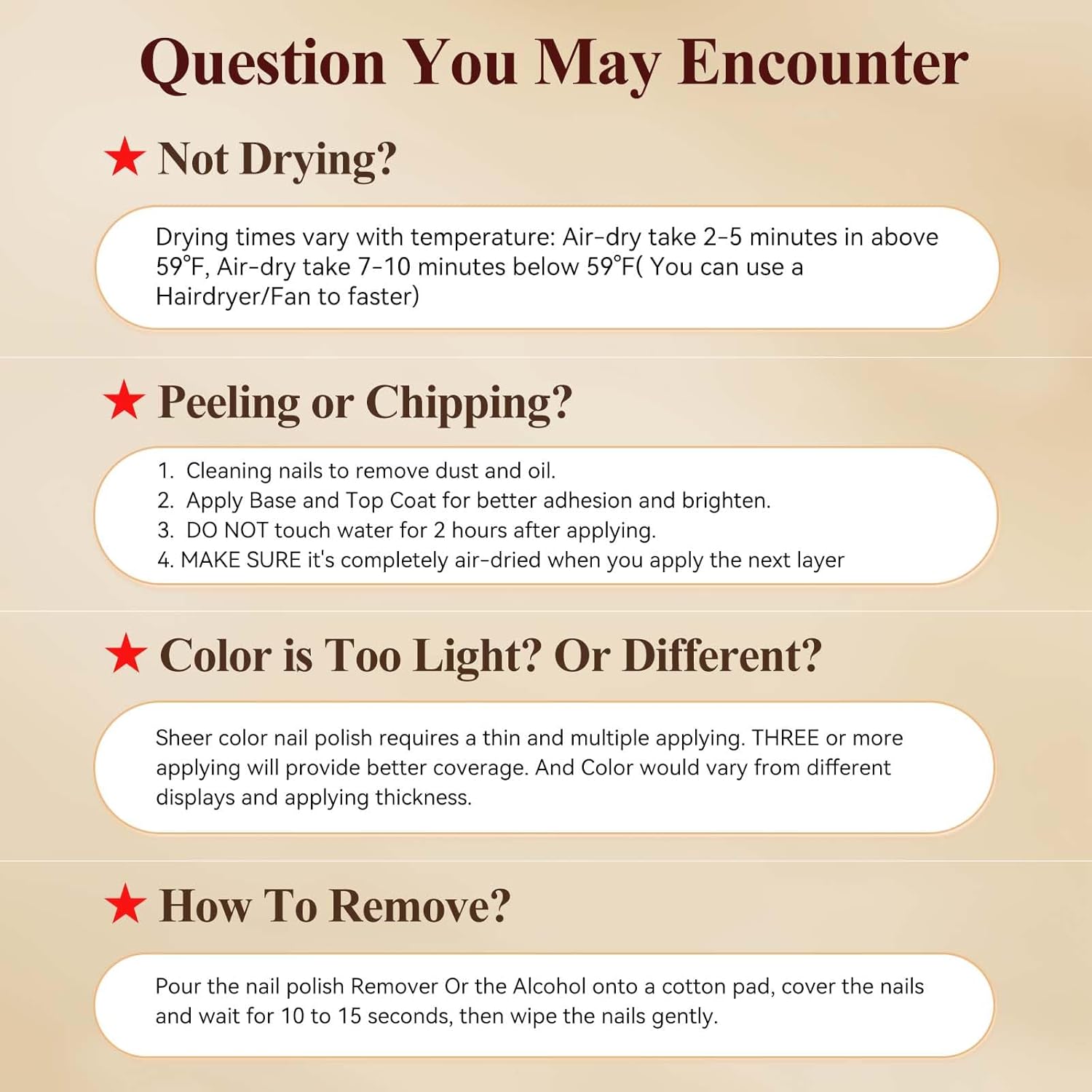 - Oil-Based, Long-Lasting: Upgraded Oil-based nail polish can maintain a longer-lasting shine than water-based nail polish and is not easy to peel off, Only apply 1-2 coats to achieve strong coverage
