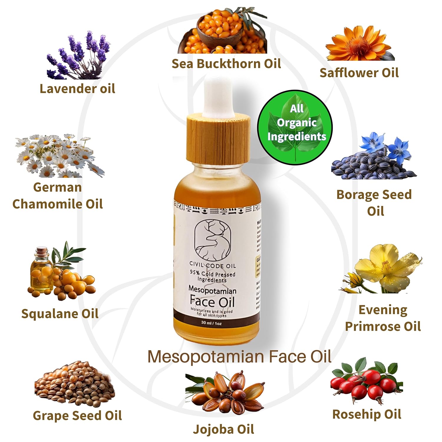 Civil Code Mesopotamian Face Oil – Organic Anti Aging Facial Oil for Women with Sea Buckthorn, Jojoba, Squalane & Lavender – Hydrating Skin Care for Dry Skin & Fine Lines – Natural Skincare 1oz