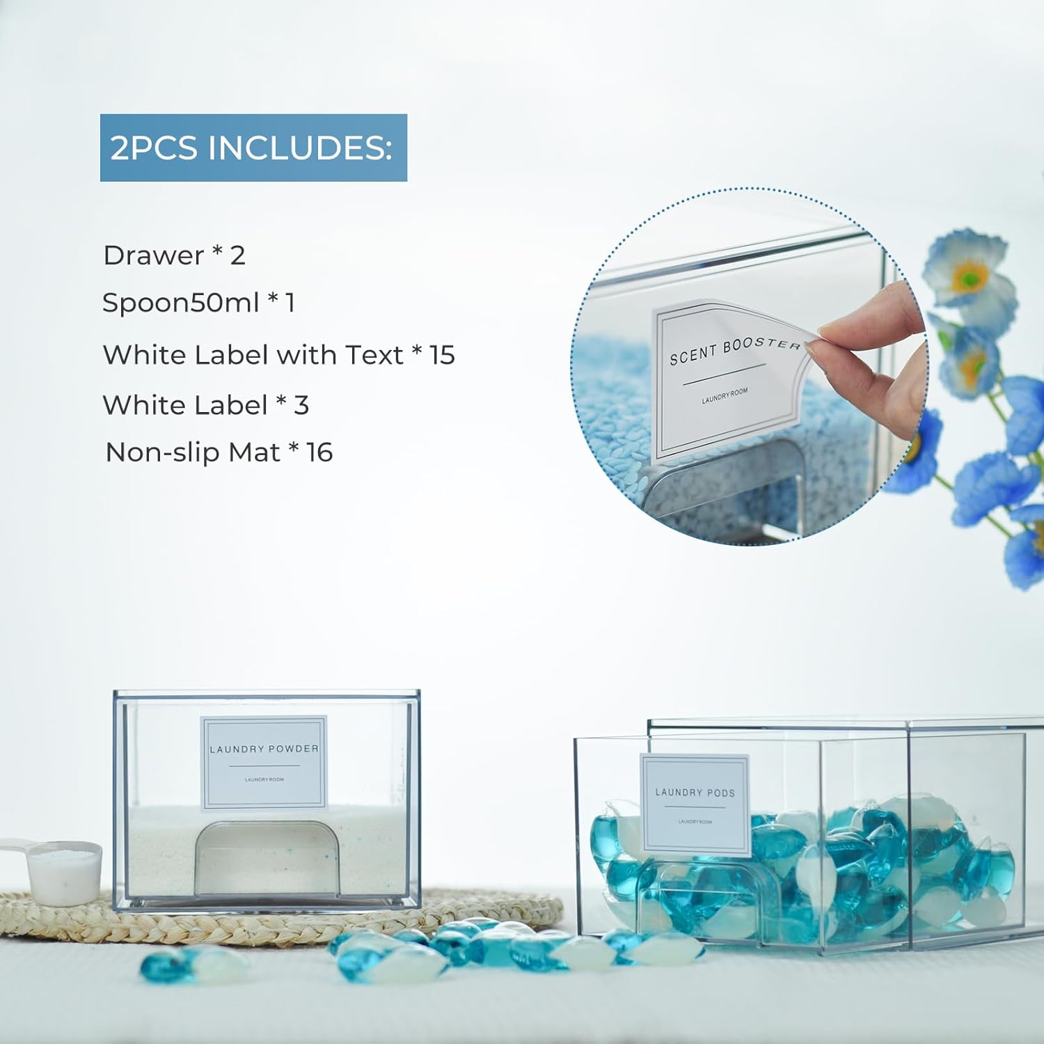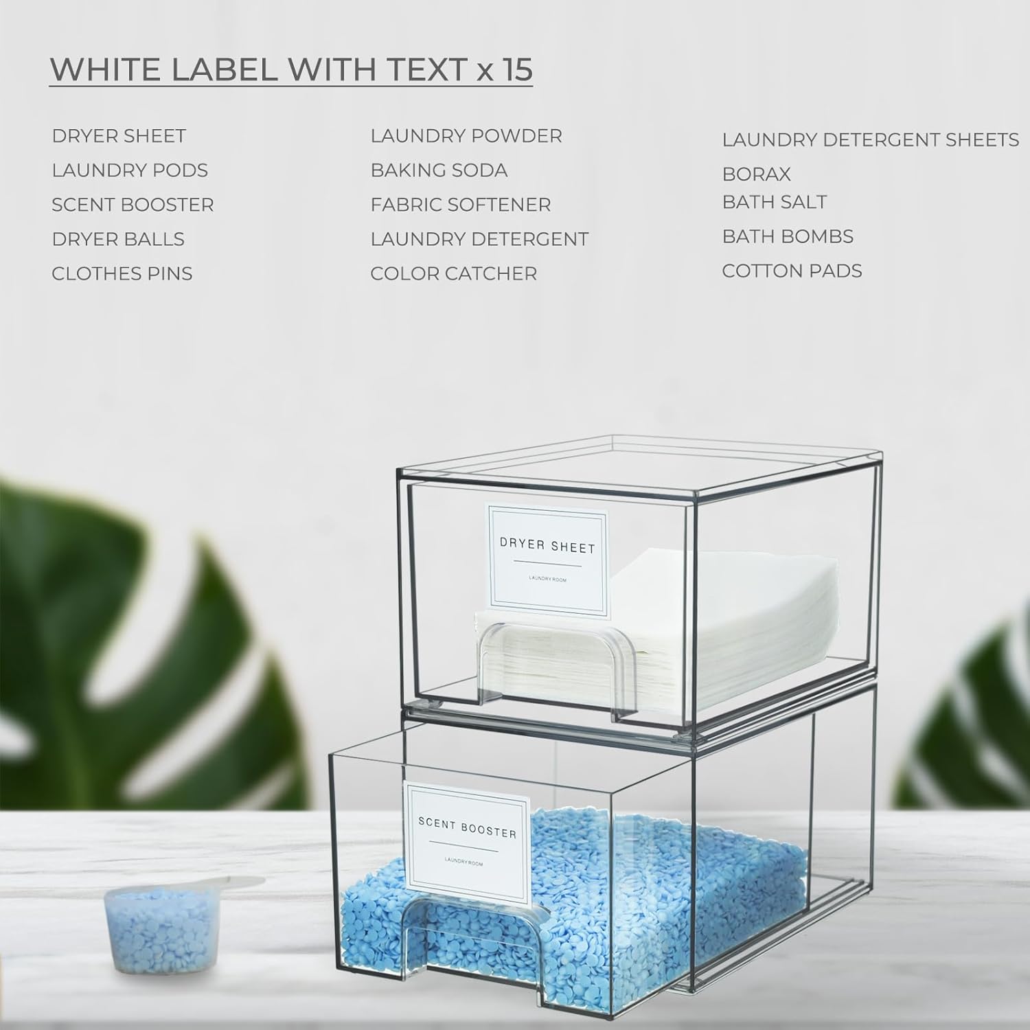 - Labels Included: To further enhance organization, our set of 2 pack laundry containers for organizing includes 18 labels . You can easily label each drawer according to its contents, making it even easier to find what you need. Stay organized and save time with our convenient labeling system. It's also includes 1 scoop specifically designed for measuring out laundry products accurately