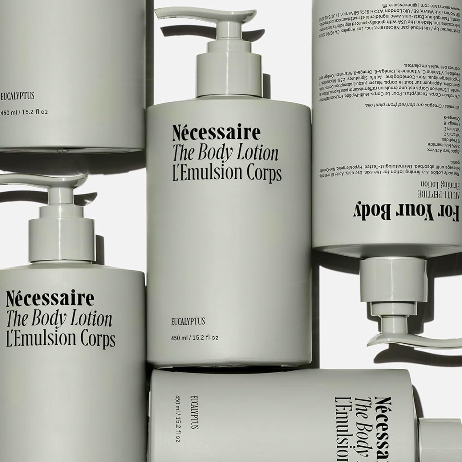 Nécessaire The Body Lotion with Pump. Eucalpytus. Multi-Peptide Firming Lotion to Moisturize, Firm, Strengthen. 2.5% Niacinamide, Vitamin C/E + Omega 6/9. 450ml / 15.2 fl oz