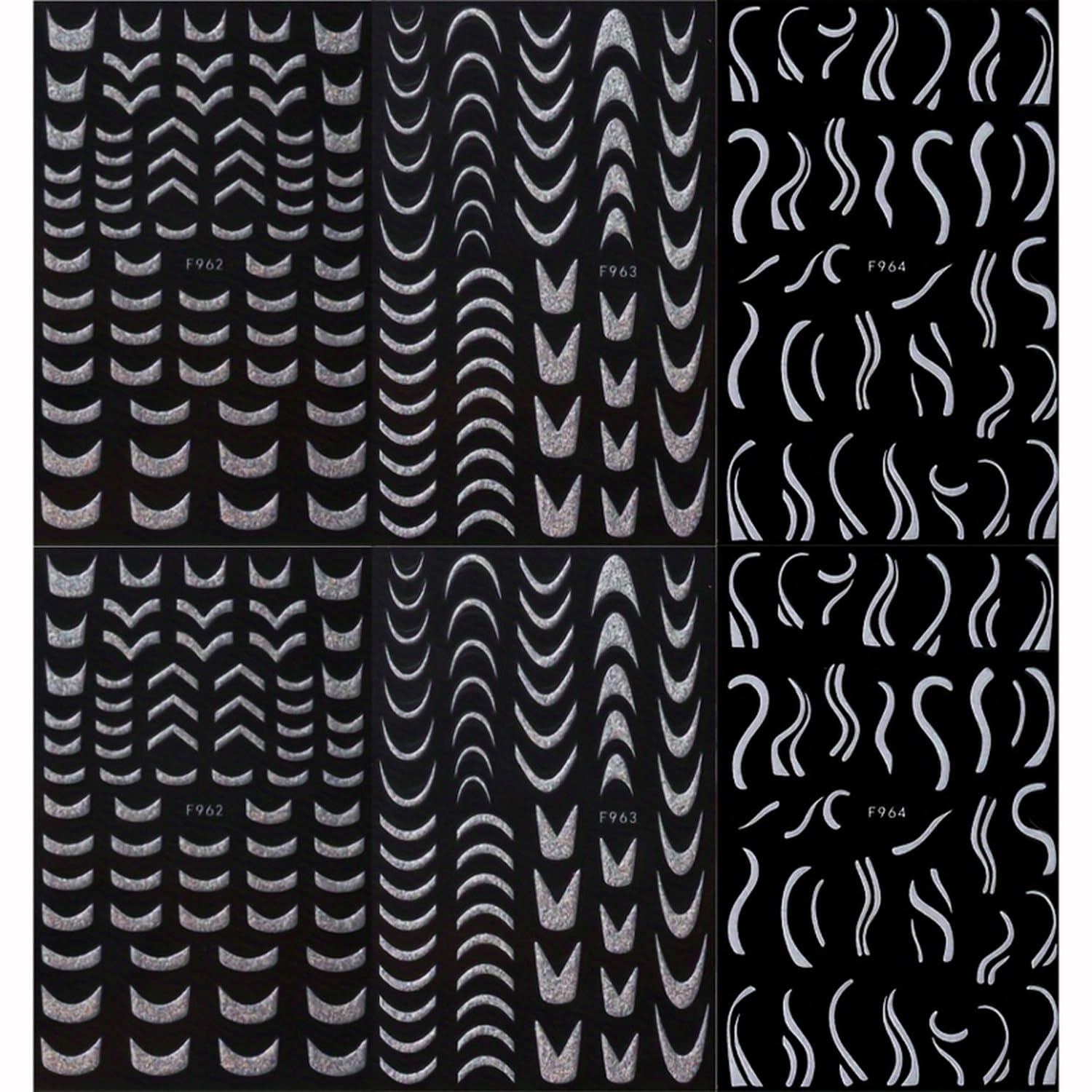 6 Sheets 3D Self-Adhesive French Tip Nail Art Stickers Decals Silver Glitter Nail Stickers Sparkly Nail Decorations Decals Curved Lines Nails Art Designs for Women DIY Nail Art Accessories