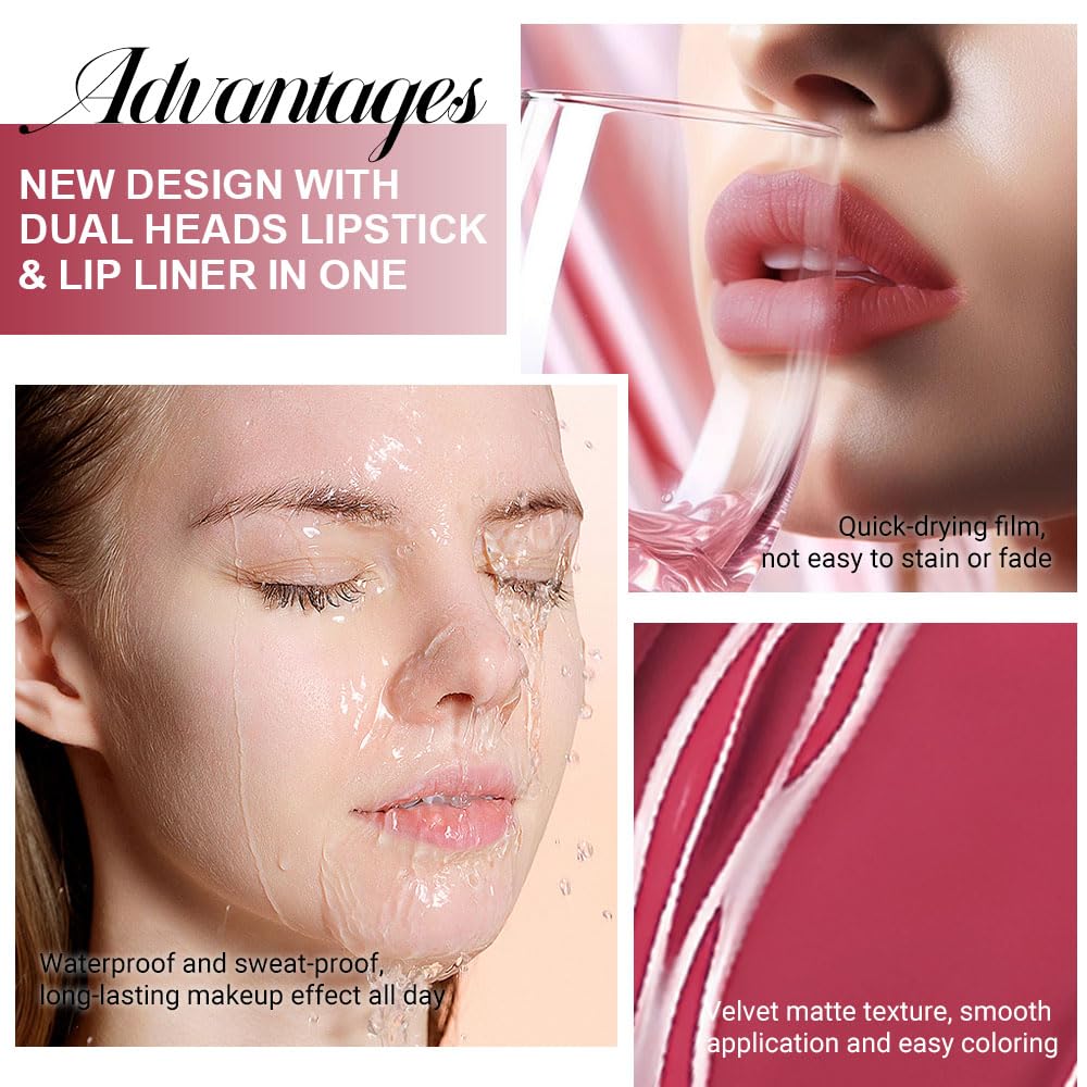 - 【2 IN 1 Lip Liner & Liquid Lipstick】The double ended design made you can use lipstick and lip liner on both ends. New design with dual heads lipstick & lip liner in one, for draw delicate lip line before applying lipstick. It combines lip line and liquid lipstick and makes double-end lipstick more perfect,meets the need of all occasions.