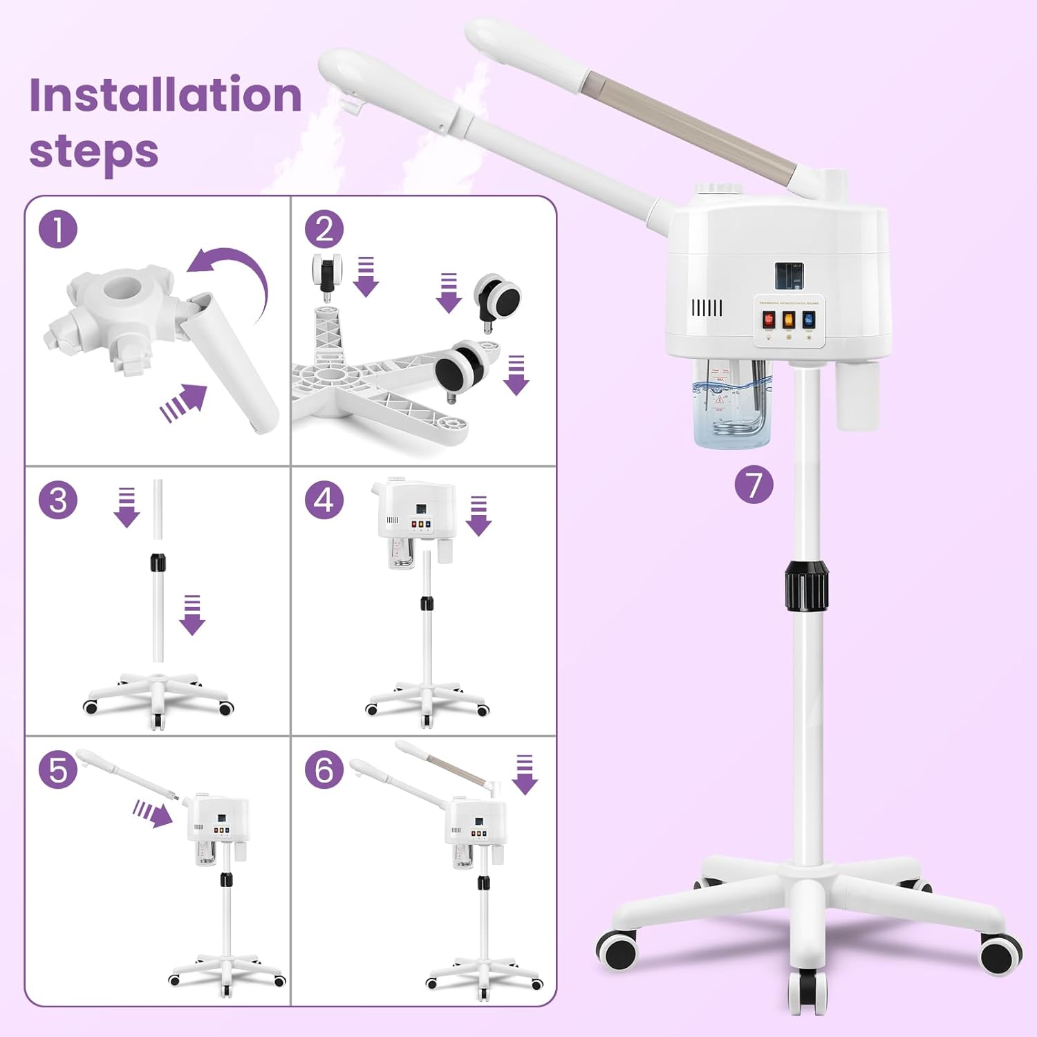 - 【Facial Steamer Adjustable】Adjustable height form 36-52 Inches, 360°rotatable and smooth wheels, 360°rotatable main body, 360°rotatable nozzle, adapt to a variety of needs.
