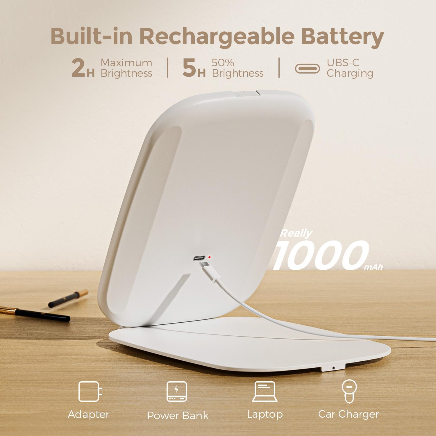 - USB C rechargeable portable makeup mirror, built-in sufficient 1000mAh lithium battery, can provide more than 2 hours of working time, no need to replace the battery or frequent charging
