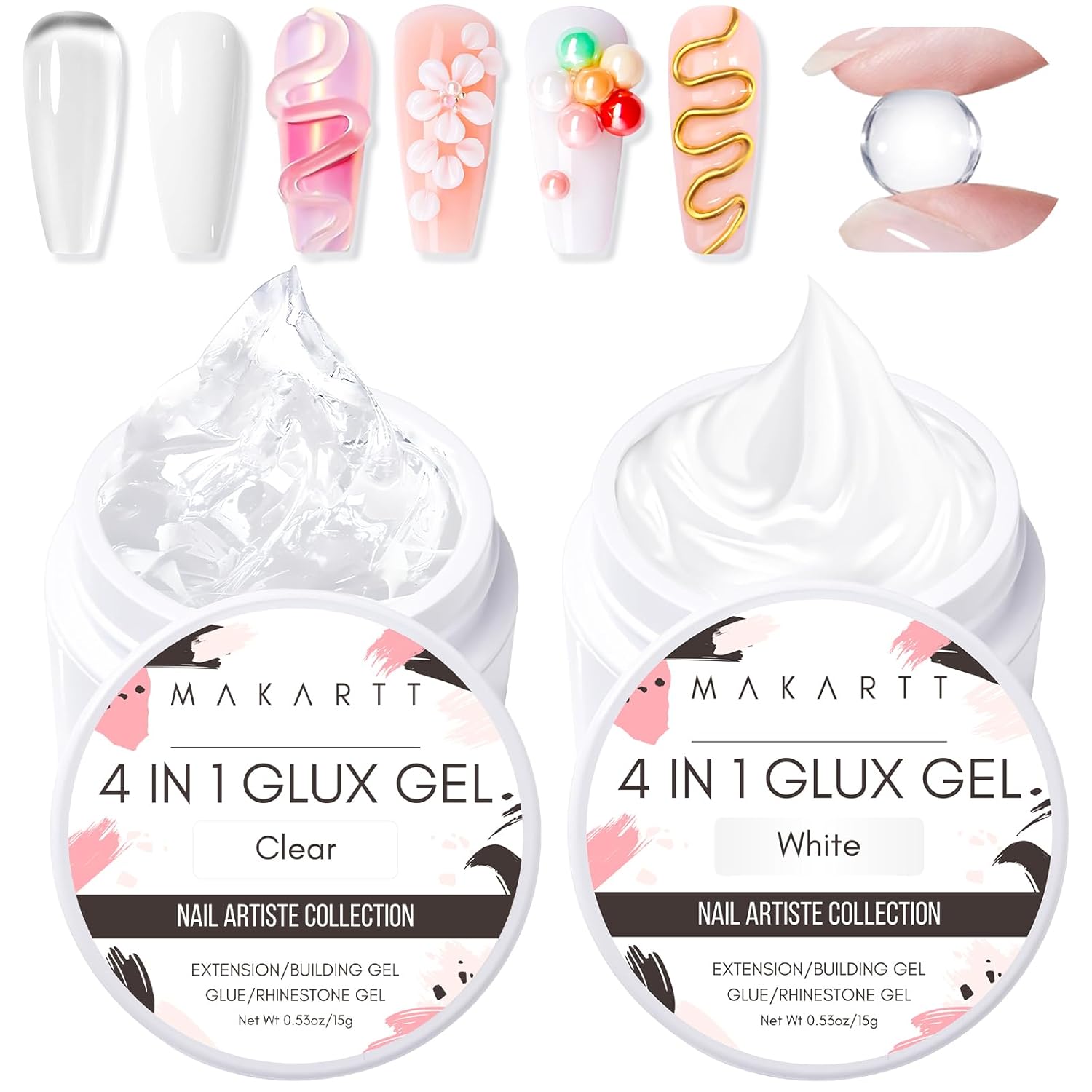 Makartt 3D Gel Nail Art: 4-in-1 Clear & White Solid Gel Builder Non-sticky for Extension 3D Sculpting Nail, UV Glue for Acrylic Nails, Rhinestones & Sculpture Hard Gels for Nails UV/LED Lamp Required