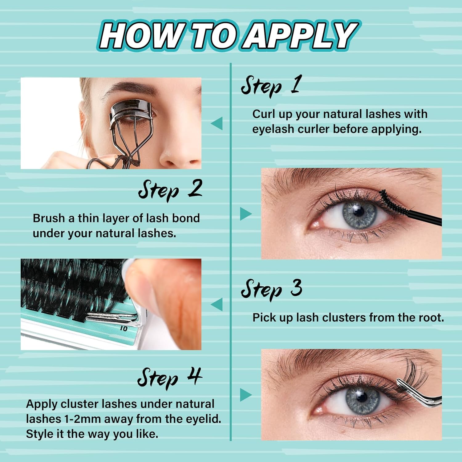- 【Easy-to-Use Tips】Gently pinch up the false eyelashes from the base with the lash tweezers, then brush a thin layer of waterproof lash bond to the root. And apply the fake lashes 1-2 mm from the eyelid. Then repeat the operation several times. You can DIY your own eyelashes with different makeup styles, individual lashes cluster can be easily removed from the paper card. With a little practice, you can do any lash style you want with lash clusters in 15 minutes.