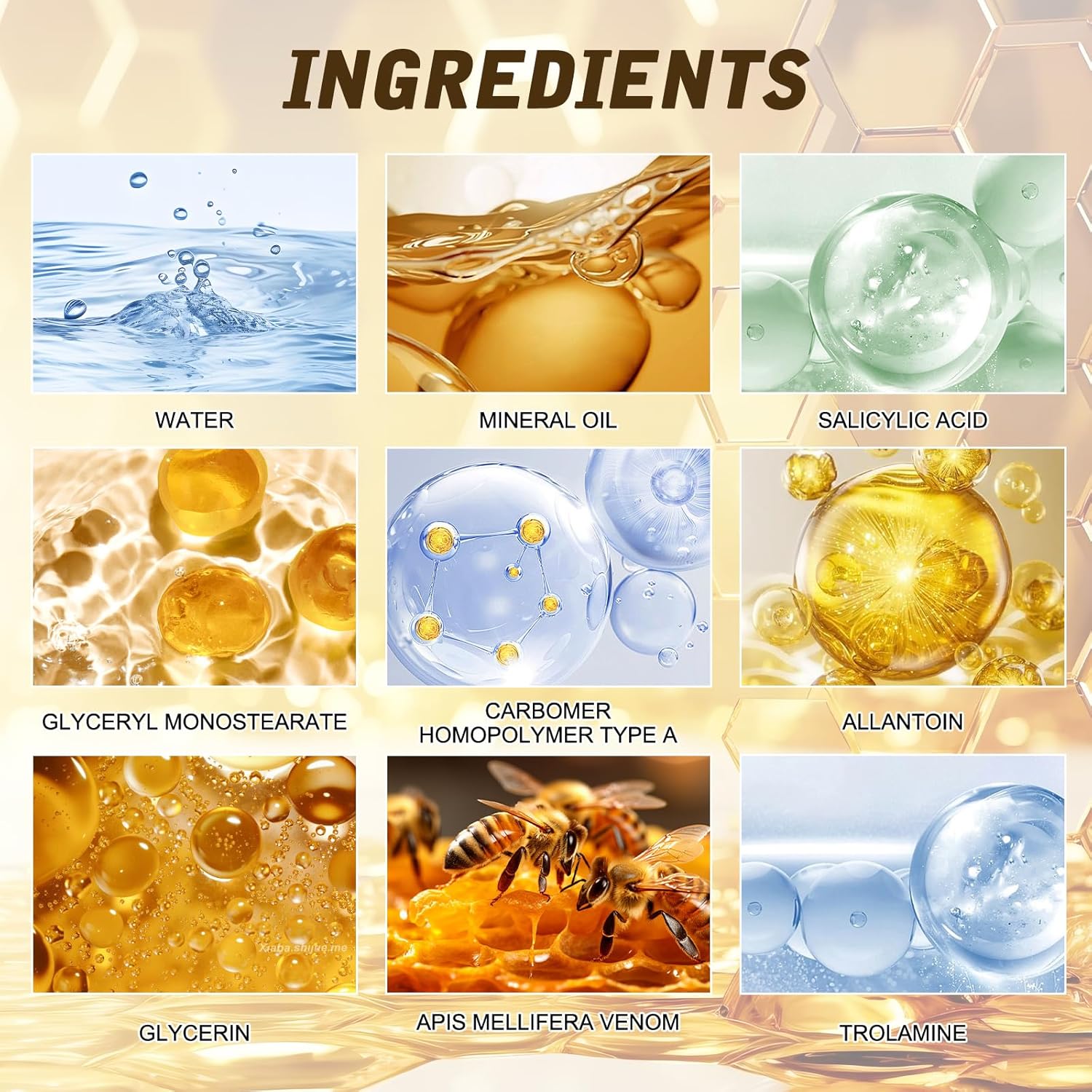 - Powerful Repair: Enriched with bee venom, this bee venom cream stimulates collagen production and accelerates skin repair, reducing the appearance of scars, blemishes and other imperfections