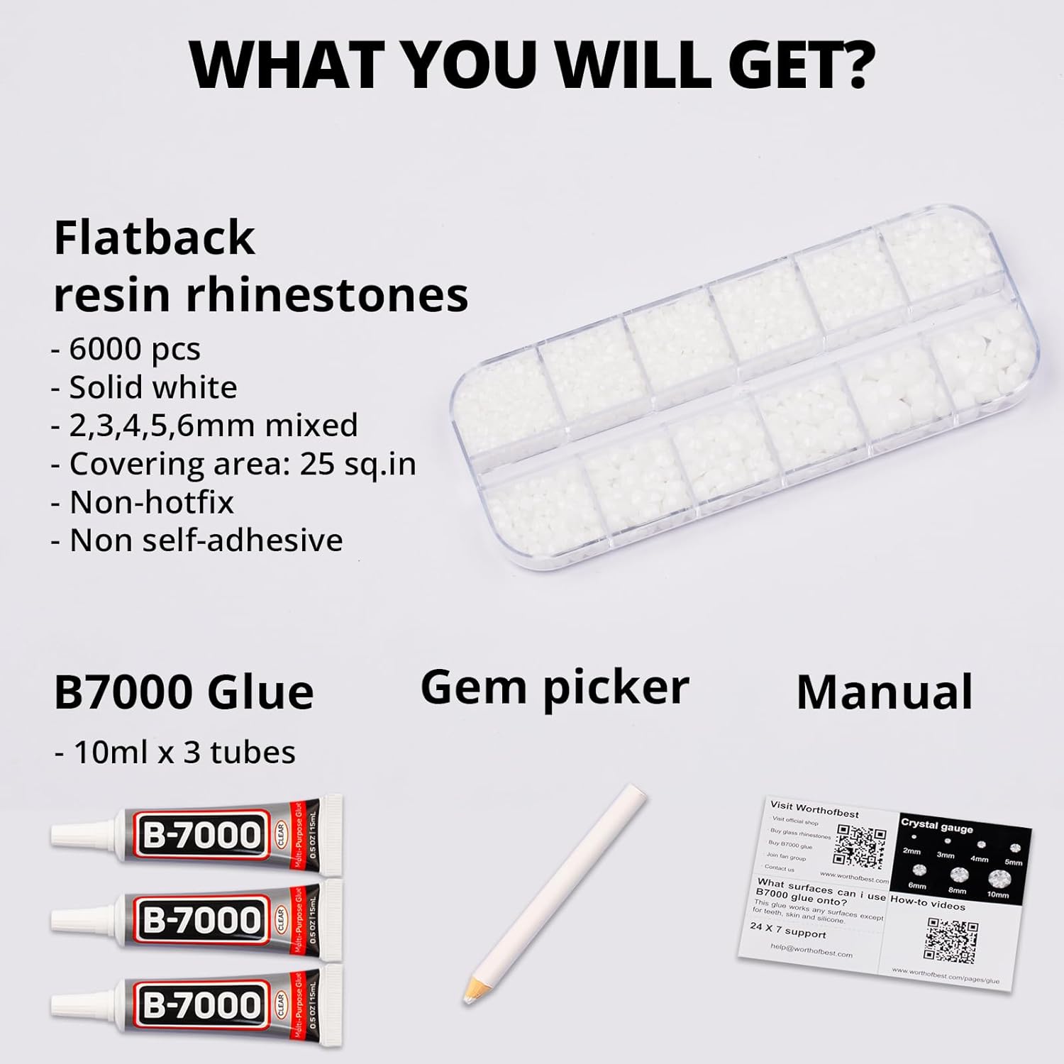 - Package Content with Tool (pickup pen and manual) -- The bedazzler kit Package includes 1 solid white rinestones set with 12 grids, approx. 6000 pcs of 2,3,4,5,6mm bling-out resin rhinestones