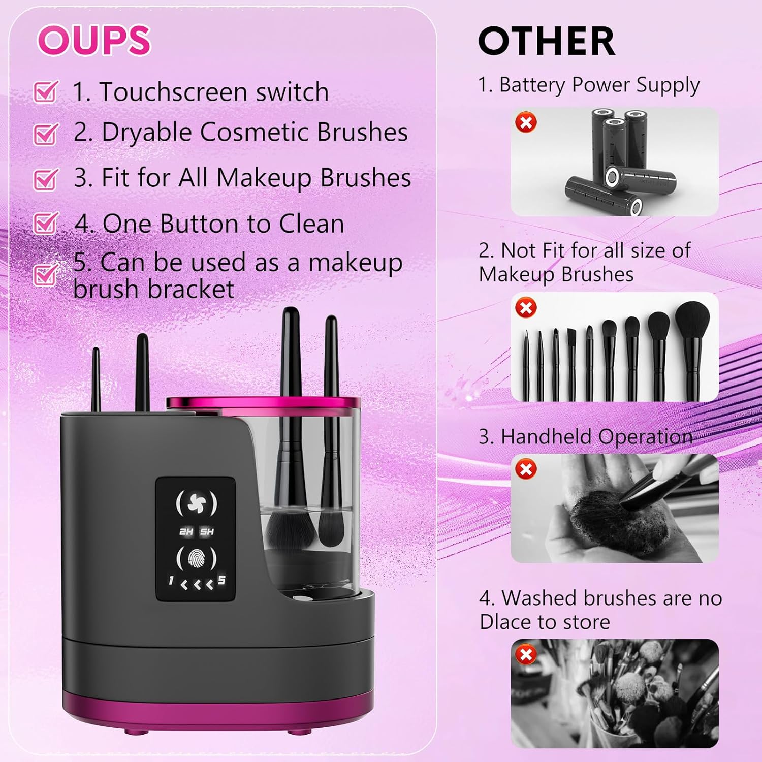 - 【Customizable Drying & Timing】The makeup brush cleaner machine includes a built-in timer offering a 5-minute cleaning cycle, while drying times can be customized (2 hours in summer, 5 hours in winter) for the best results.