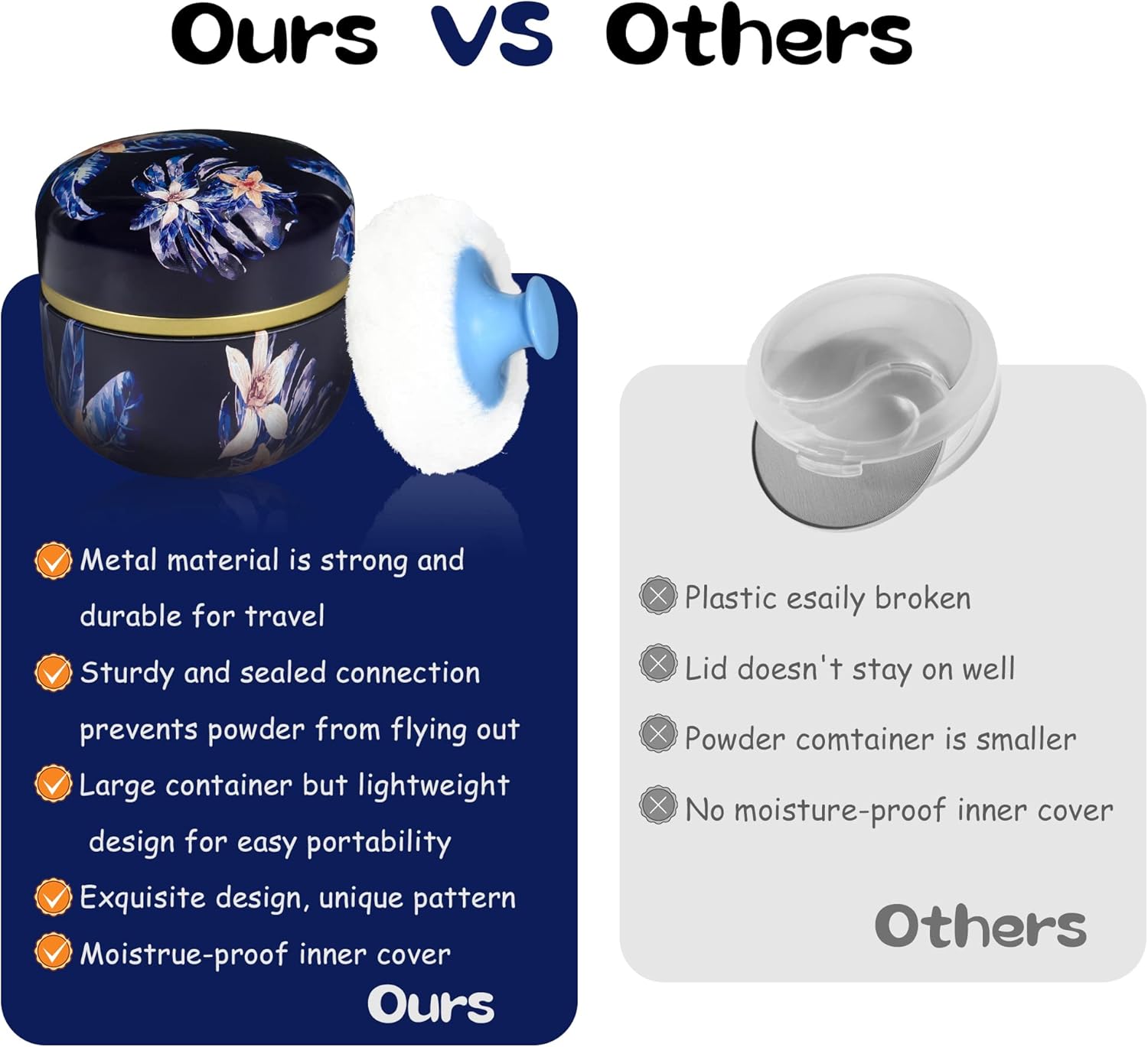 - Product contains a well-made powder case, a high quality powder puff with a handle and a small powder puff.