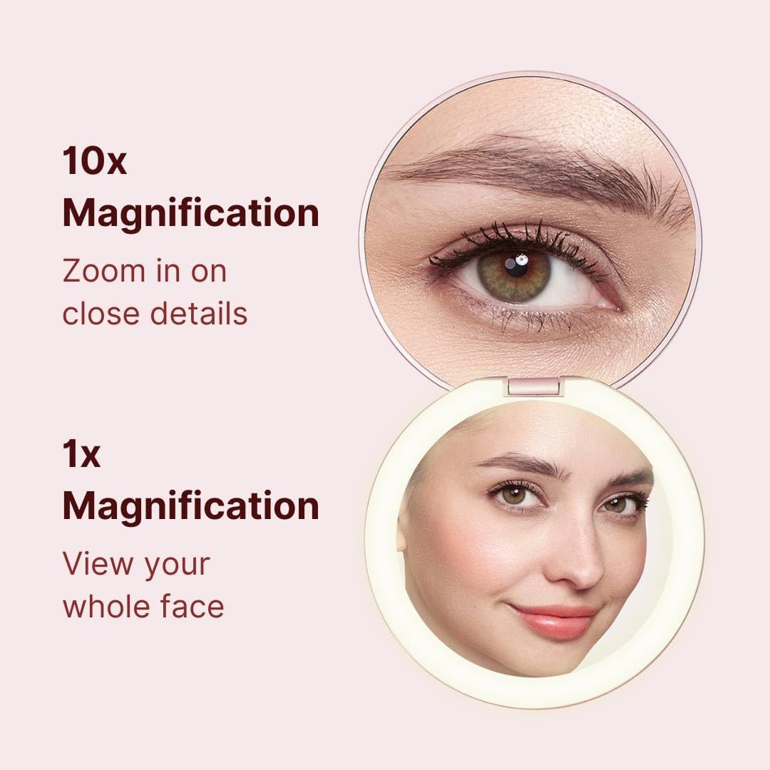 - Double-sided magnification (1x and 10x) so you can apply a full face of makeup, do a quick touch-up on the go, or focus on a detailed task like tweezing or inserting contact lenses