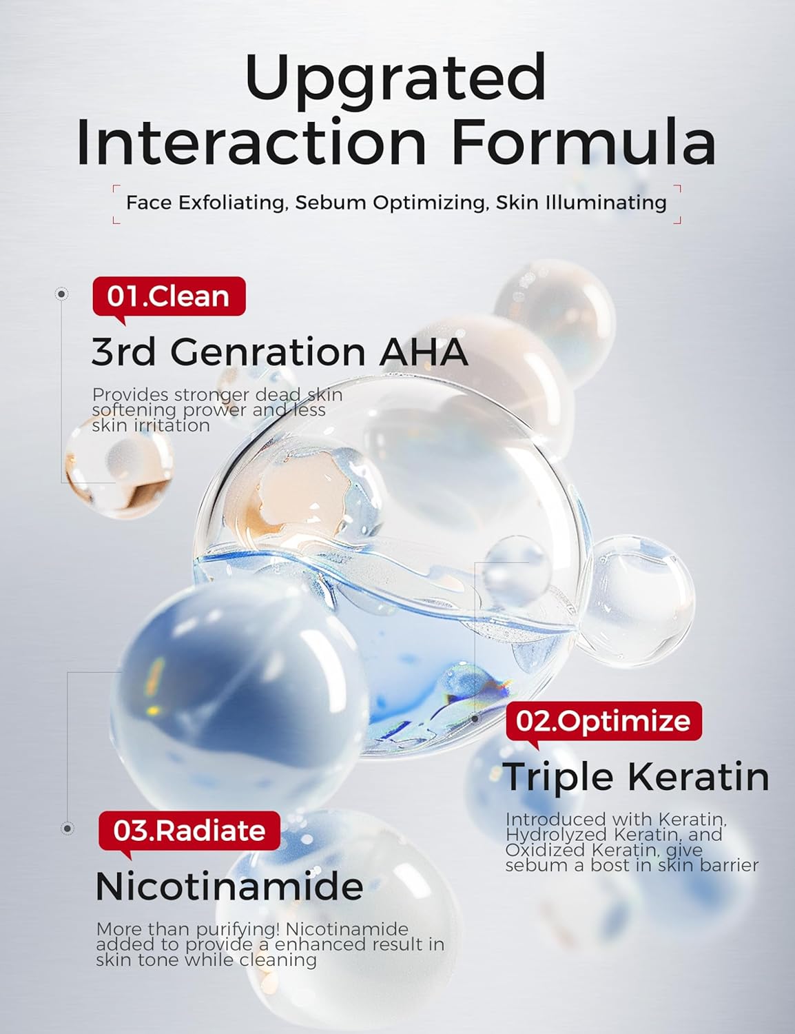 - SUPPORTS SKIN GLOWING & HYDRATION: Infused with niacinamide and three types of keratin, this face exfoliator helps maintain skin hydration while gently resurfacing. Unlike traditional exfoliating face wash, this formula exfoliates while nourishing, leaving skin feeling soft, balanced, and healthy. Niacinamide & plant extracts help reduce dark spots, promote even skin tone, and enhance skin clarity, giving you a radiant glow