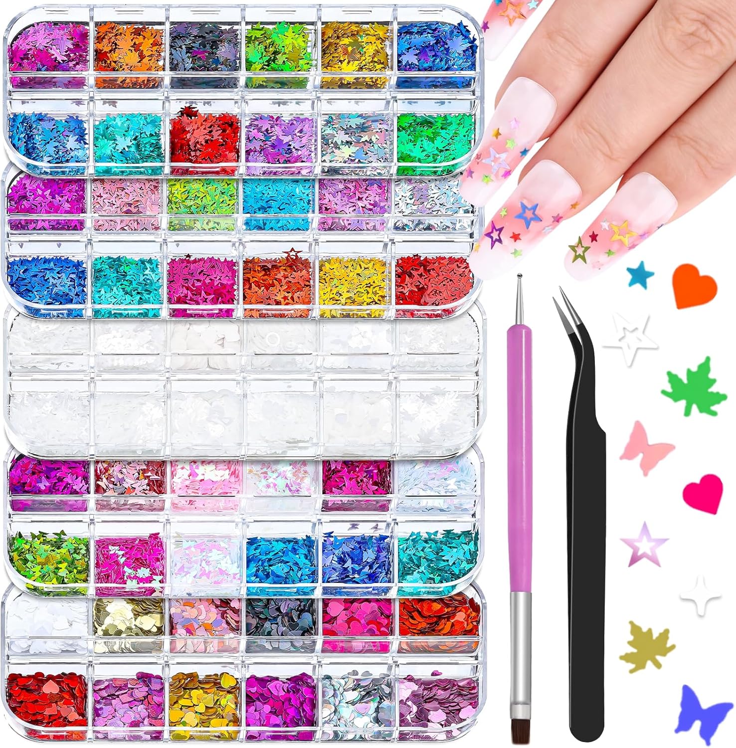 5 Boxes 60 Colors Holographic Nail Art Sequins Kit, Iridescent Sparkle Laser Hollow 3D Star Butterfly Heart Round Mixed-shapes Nail Glitter Flakes for Manicure Body Makeup Craft DIY (1-colorful-kit1)