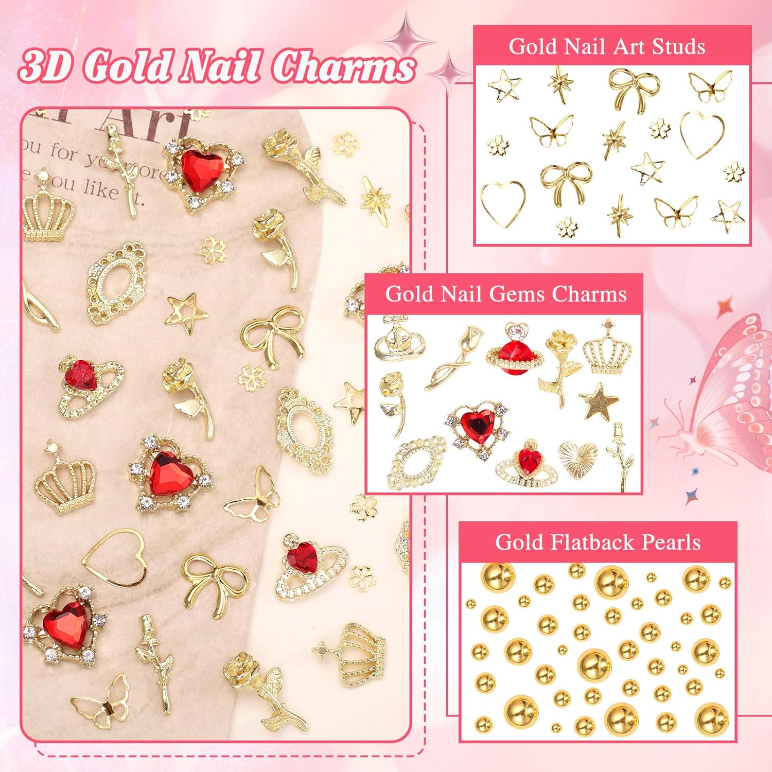 2 Boxes Metal Gold Nail Charms and Gems, 3D Alloy Crown Heart Planet Nail Gems Charms, Golden Bows Star Nail Studs, Gold Pearls Beads for Nails Art Designs DIY Accessories