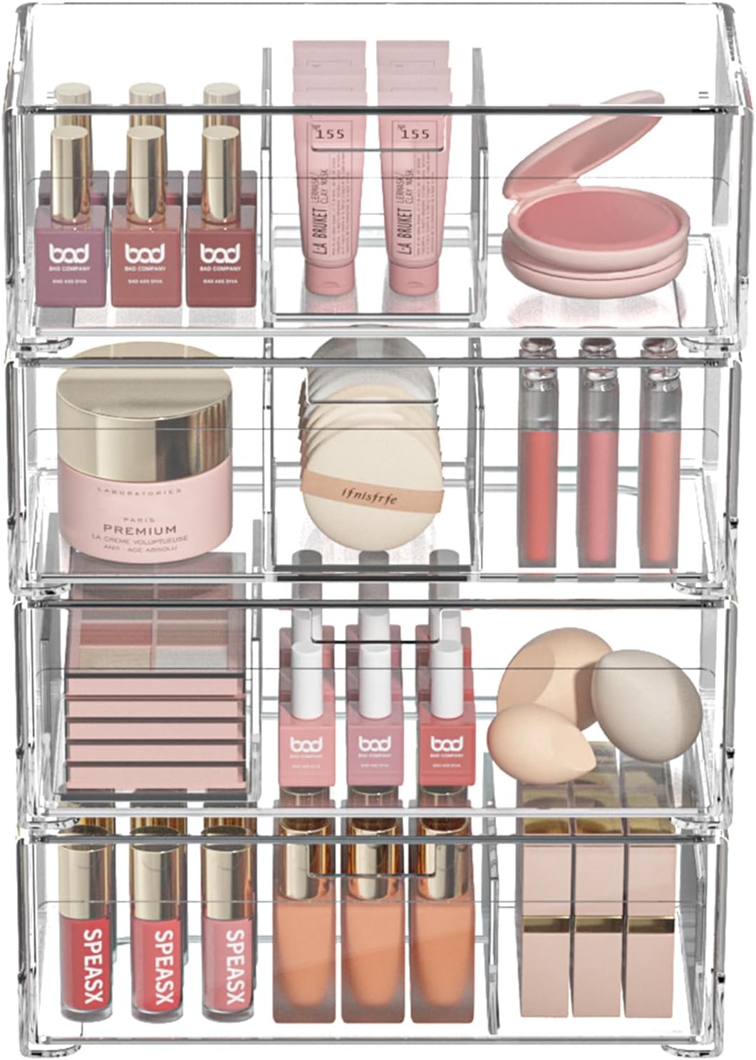 Stackable Storage Drawers Clear Plastic Storage Bins Bathroom Drawer Organizer Medicine Cabinet Organizer Makeup Organizers w Removable Divider Home Workspace Office Desktop Vanity Gift Idea 4Pack