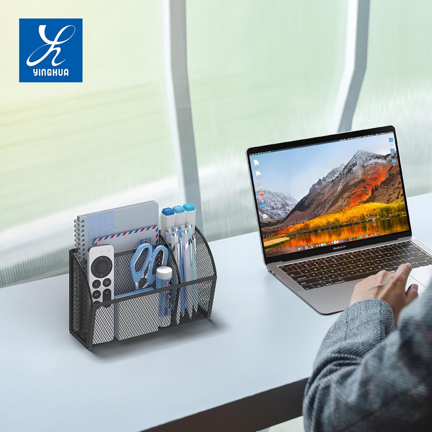 - Smart 3-Compartment Design for Better Organization – Featuring three neatly divided sections, this sleek black pen organizer for desk keeps pens, clips, sticky notes, and desk supplies neatly sorted. The open mesh design allows easy visibility and quick access, making it an ideal desk organizer caddy for a clutter-free workspace, home, or school