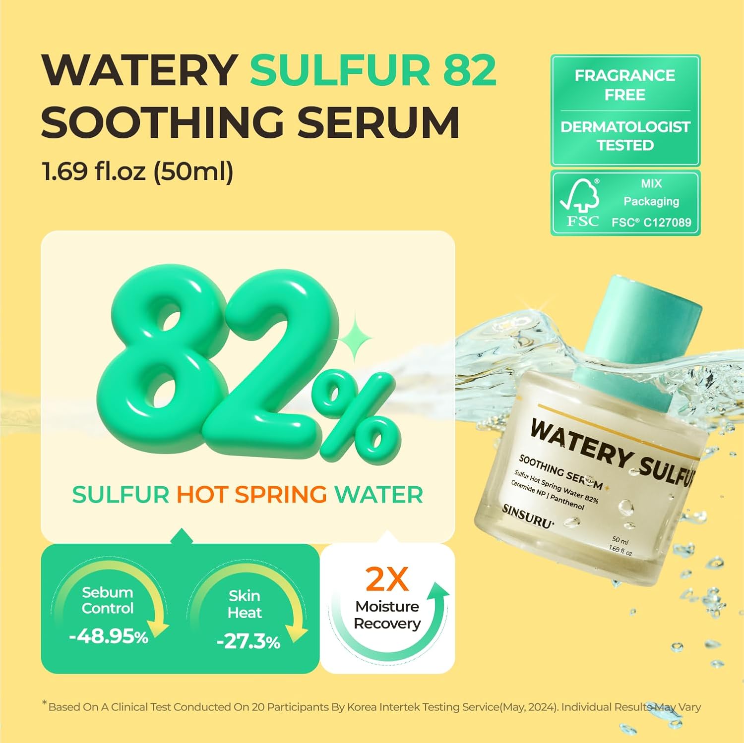 Watery Sulfur 82 Soothing Serum – Gentle Daily Face Serum for Acne-Prone & Sensitive Skin with 82% Sulfur Hot Spring Water, Fragrance-Free Formula | Korean Skincare (1.69 fl.oz / 50ml)