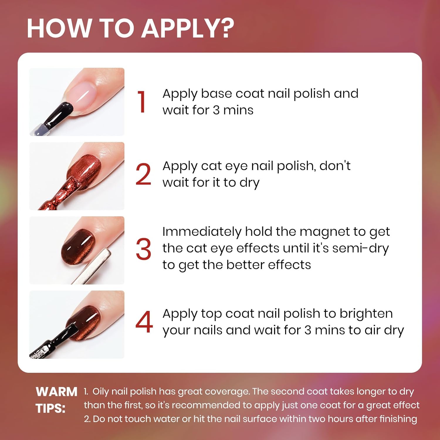 - Quick Dry Cat Eye Nail Polish: This magnetic nail polish set includes large capacity 16ml (0.54fl oz) shimmering dark red cat eye nail polish and 1 magnetic stick. The wide magnetic stick is perfect for creating a variety of charming cat eye patterns to add color to your manicure.