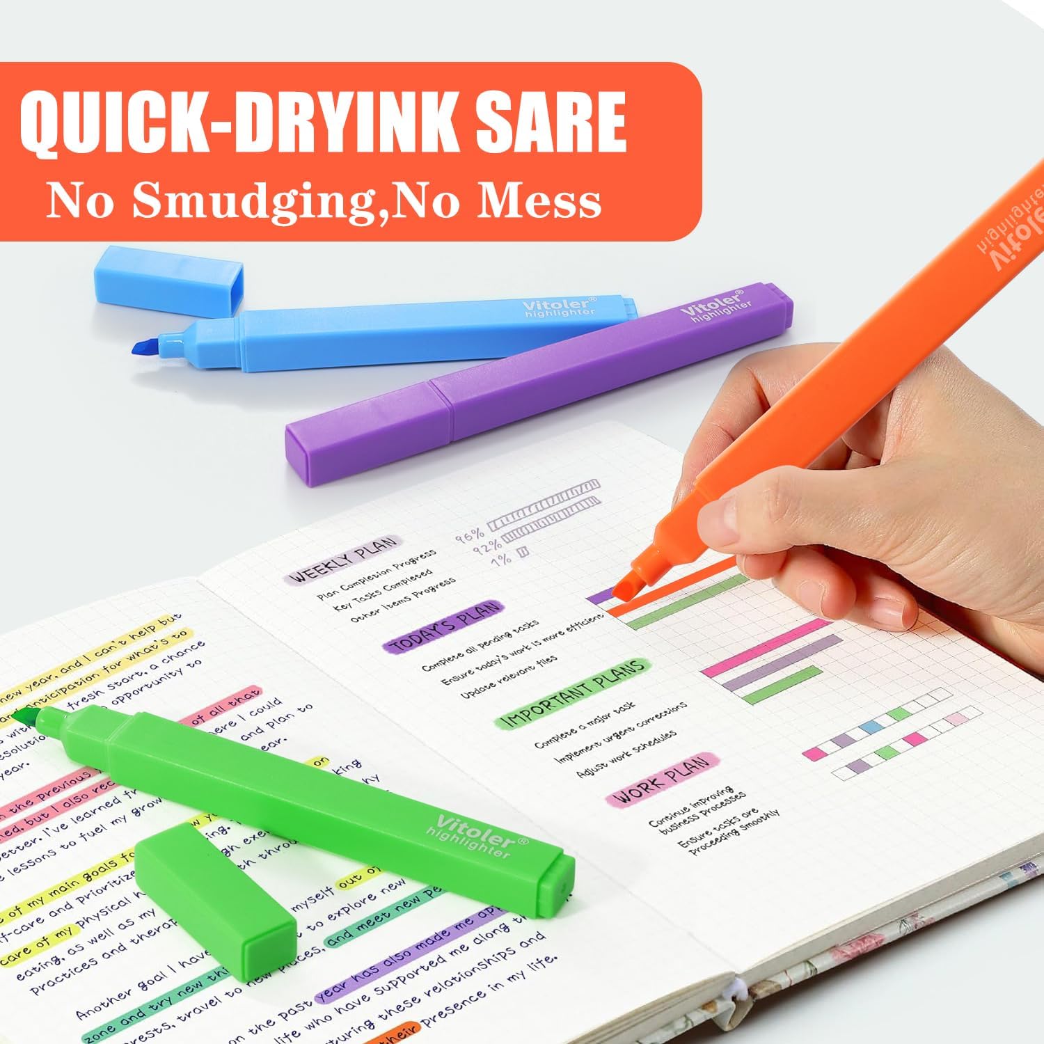 - Smooth Writing:Our highlighters use water-based ink,smooth and consistent writing .The ink flows evenly without clumping or smudging, and its color distribution is uniform