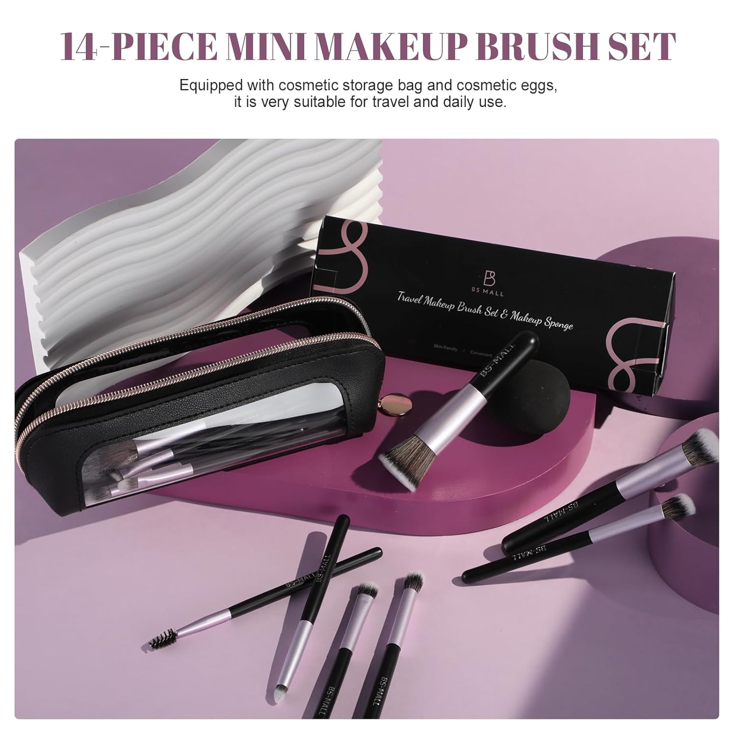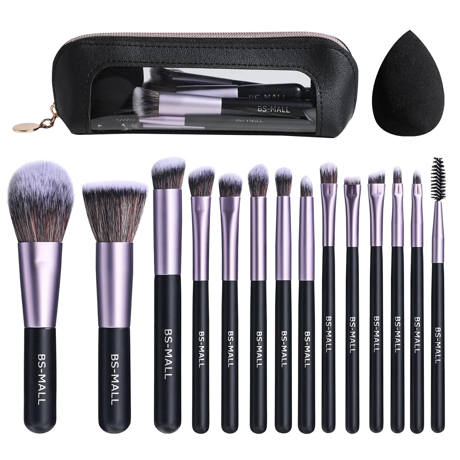 BS-MALL 14 Pcs Makeup Brushes Set with 1 Pcs Makeup Sponge – Essential Foundation Powder Concealers, Eye Shadows, Blush Makeup Brushes with Travel Makeup Case (Purple)