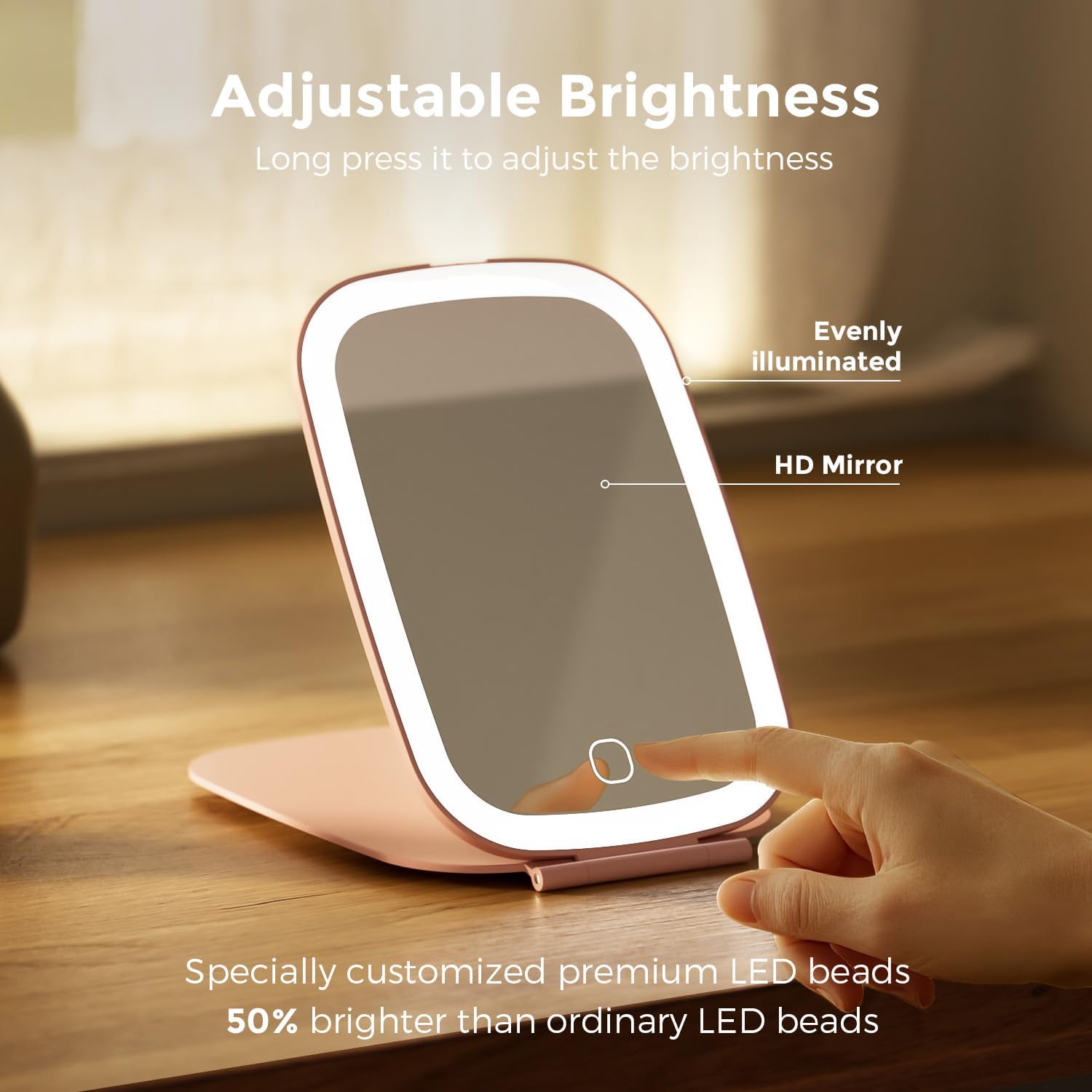 Travel Mirror with Light, Rechargeable Foldable Portable Mirror, 3 Color Lighting, 7.5 inch, Pink