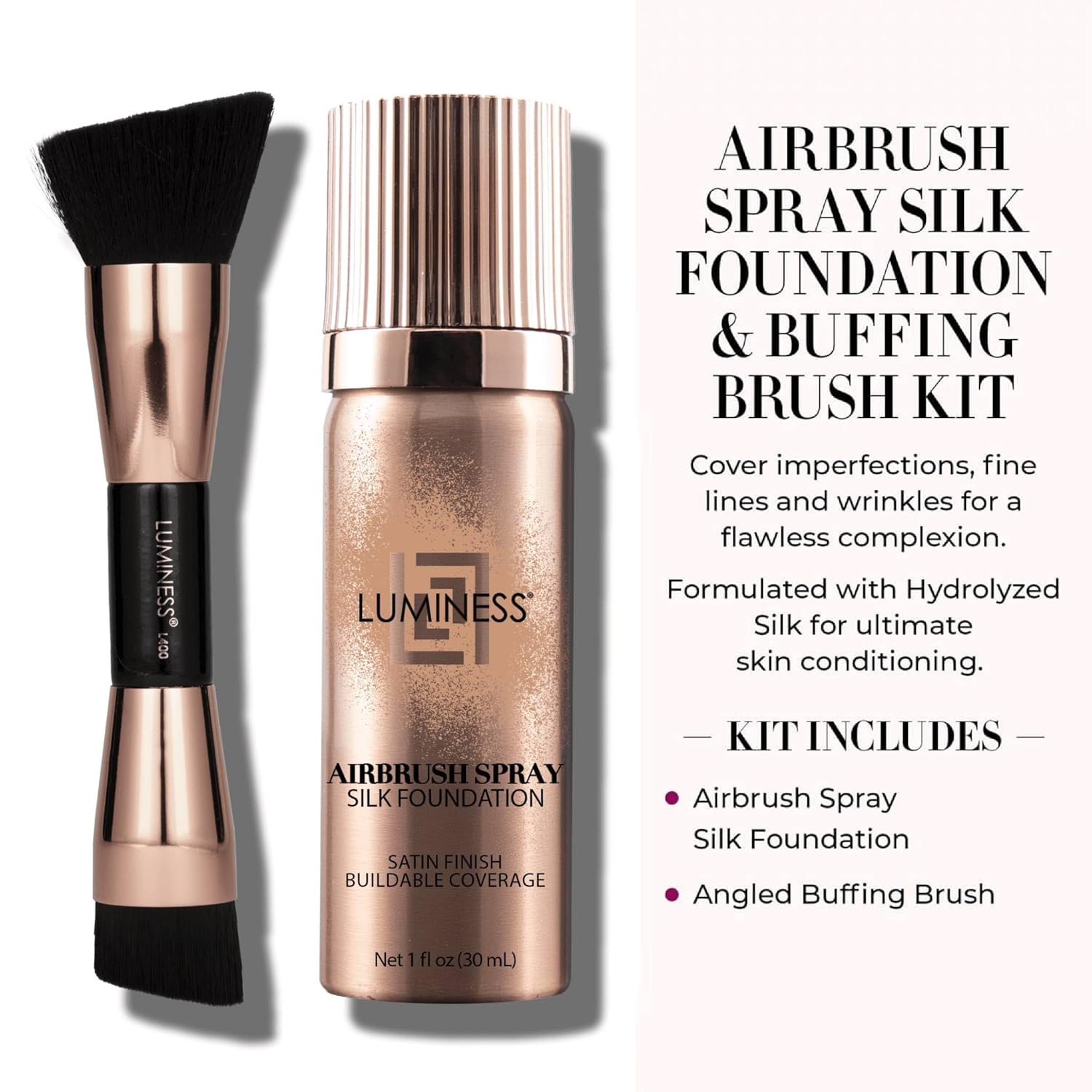 LUMINESS Silk Airbrush Spray Foundation 2-PC Kit - Foundation & Dual-Sided Angled Makeup Brush - Buildable Coverage, Anti-Aging Formula, Humidity Resistant, Hydrates & Moisturizes, Light Fair