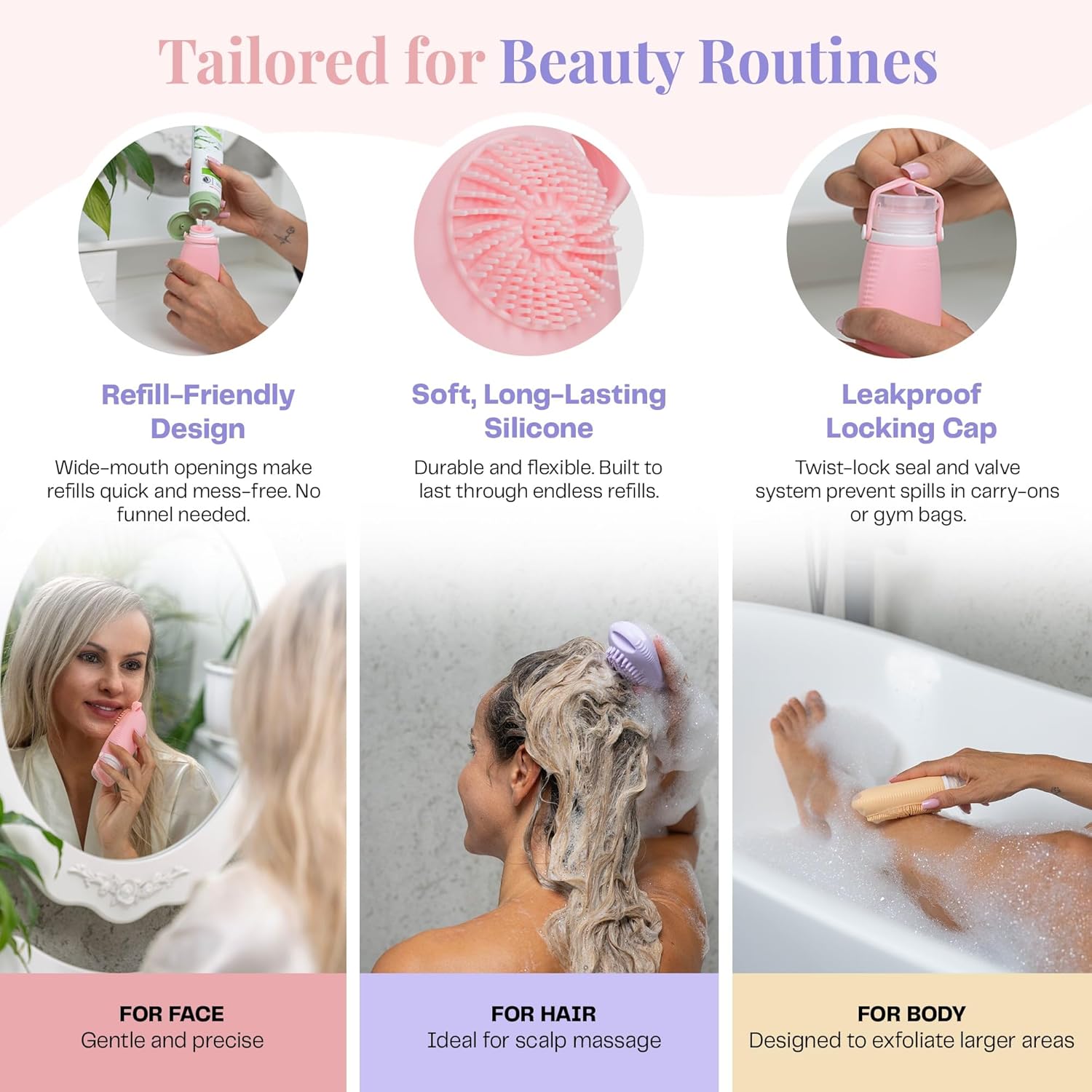 - ✅ PREMIUM, BPA-FREE SILICONE FOR EASY REFILLS | Made from soft, durable food-grade silicone that dispenses 99% of contents with a simple squeeze. The wide-mouth opening ensures mess-free refilling of shampoo, conditioner, lotion, or sunscreen—reusable and eco-friendly for sustainable adventures.