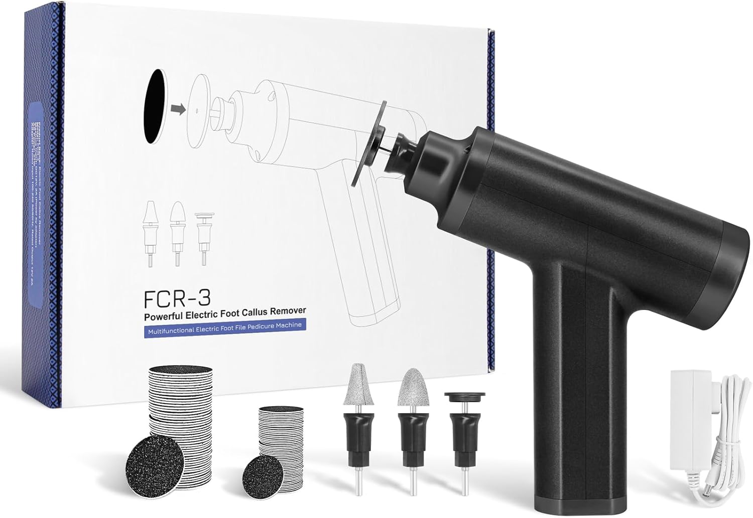 - PACKAGE DETAILS: 1pc professional FCR-3 electric foot callus remover (black), 1pc big round grinding head (use with big sandpaper), 1pc small round grinding head (use with small sandpaper), 2pc tapered grinding heads (no need sandpaper), 60pcs big sandpaper discs, 20pcs small sandpaper discs…The machine's ergonomic design ensures a comfortable grip and comes with a clear instruction manual.