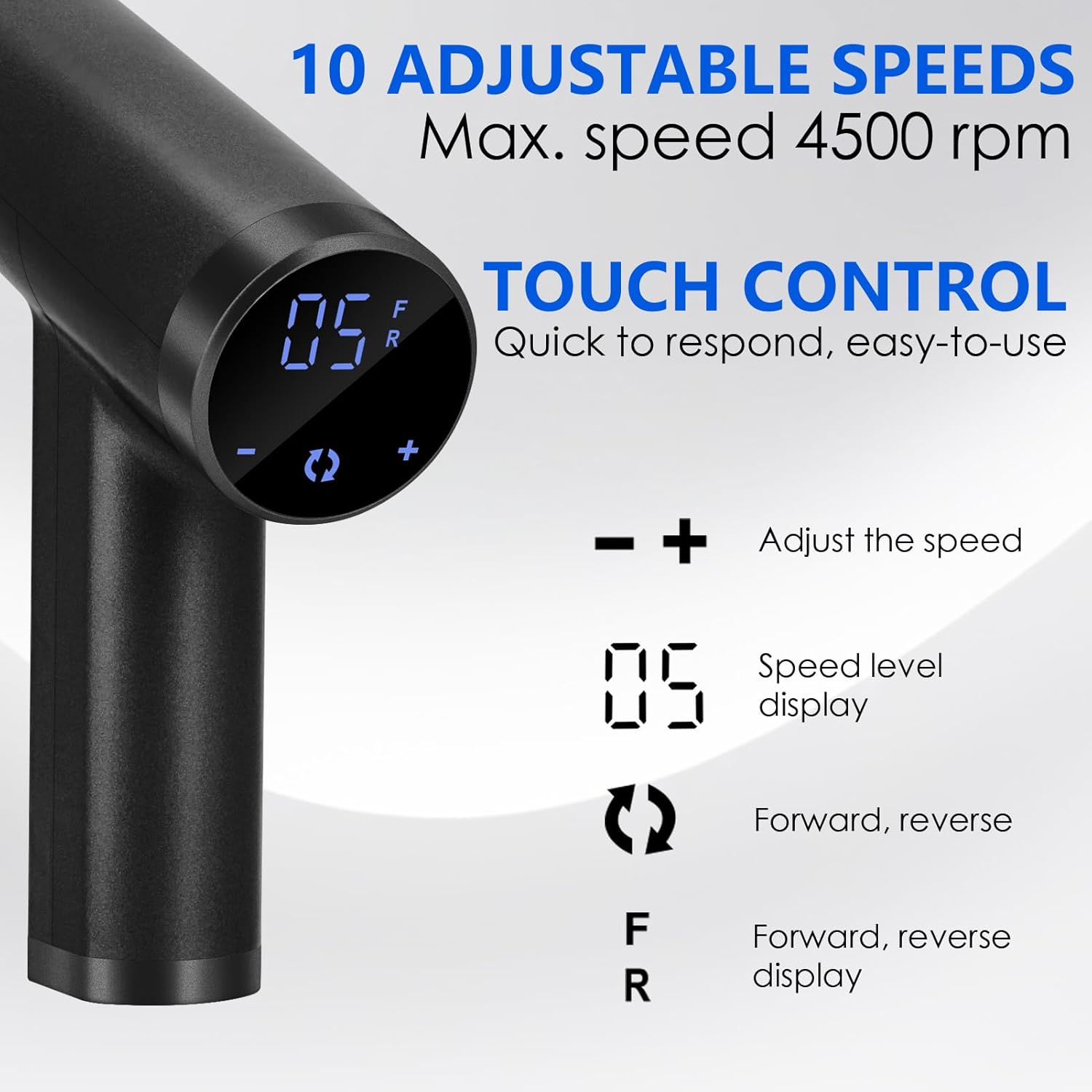 - RESPONSIVE TOUCH CONTROL: The touchscreen is very responsive and make it super easy to use, so you can easily adjust the speed, forward and reverse as needed. (there is also a thin plastic film that's over the LED screen that you remove.)