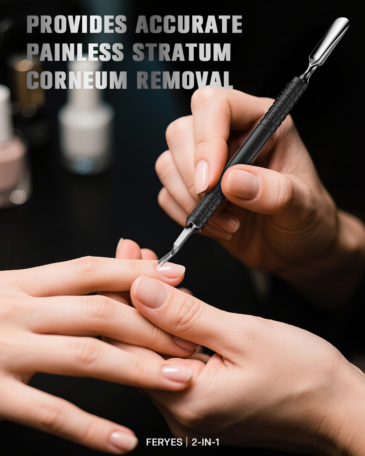 FERYES Cuticle Pusher with Fork, 2-in-1 Cuticle Remover Tool, Upgraded Stainless Steel Cuticle Trimmer Nail Care Tool for Manicures- Black(5.8 Inches)