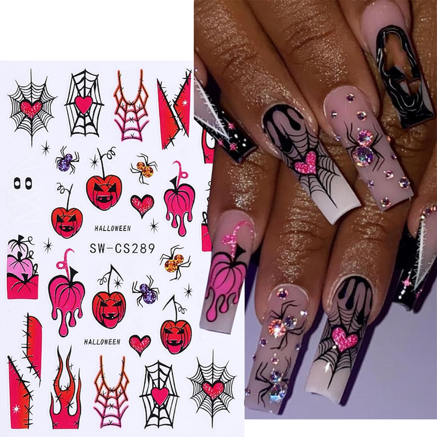 6 Sheets Halloween Nail Art Stickers Decals 3D Self-Adhesive Cartoon Bat Spider Web Skull Nail Stickers French Flame Spider Web Heart Nail Decals Supplies for Women DIY Holiday Manicure Decorations